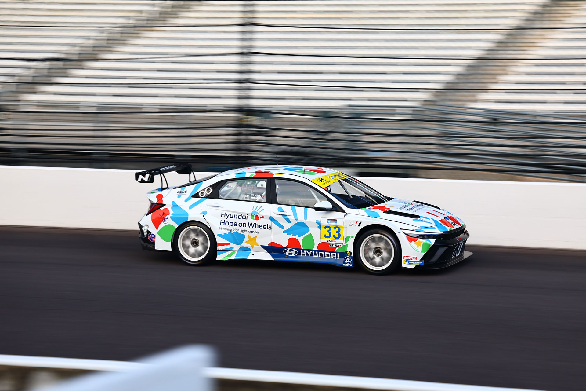 The No. 33 Hyundai Elantra N TCR with the Hyundai Hope on Wheels livery, driven by Bryson Morris and Mark Wilkins, is photographed during the Indianapolis Motor Speedway 120 race at the Indianapolis Motor Speedway in Indianapolis, Ind., Sept. 20, 2025. (Photo/Bryan Herta Autosport/LAT)